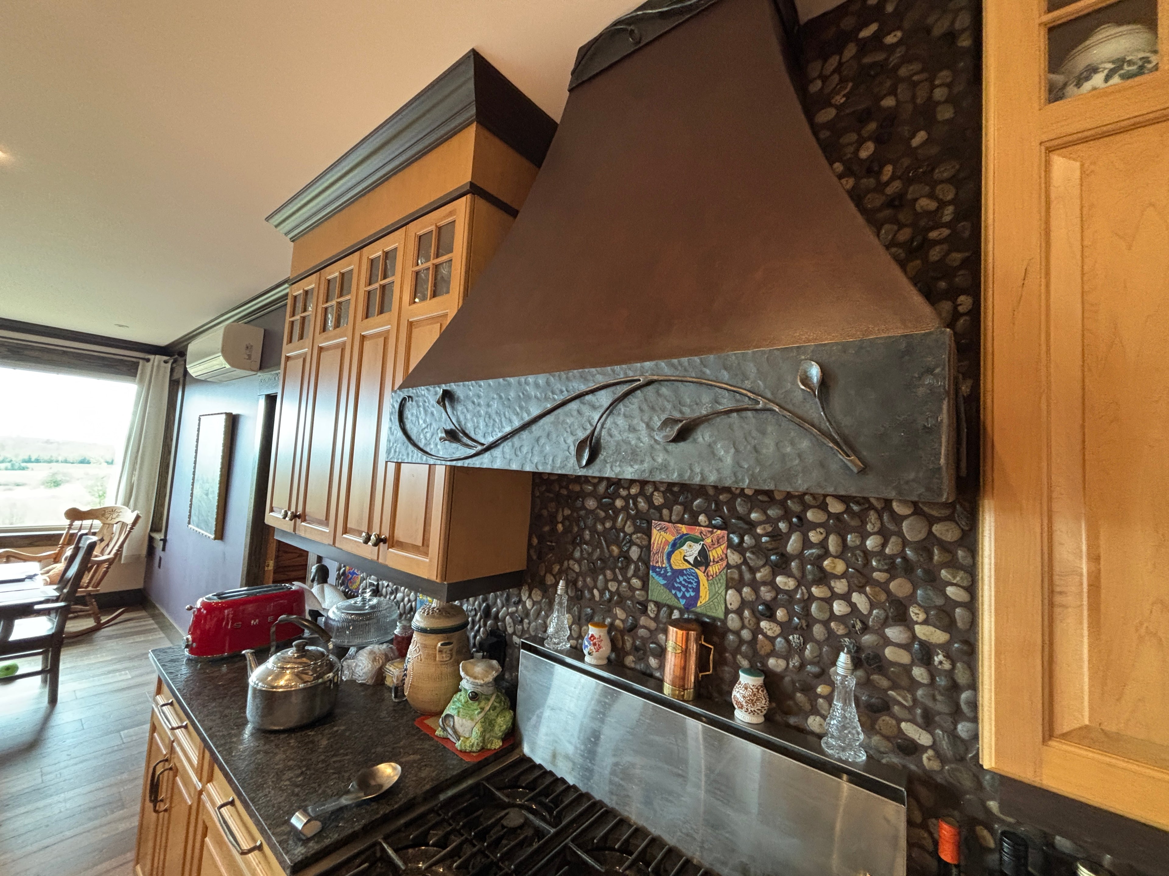 "When we were planning our new house, we were searching for options for a range hood. We had a wide six burner propane stove so we wanted something that would look appropriate and handle the air volume. We looked at other suppliers but couldn’t put the look we wanted together with the function required. We decided to ask Ruben Irons who we knew was an excellent blacksmith but not typically into range hood construction. We outlined what we wanted and he came up with a design that suited perfectly. He completed it well within the time limits and brought it over and we installed it together. This is the type of thing I would pull out if I moved and take with me, you just can’t buy stuff like this and I will always know that it was custom made to fit my needs. We couldn’t be happier."