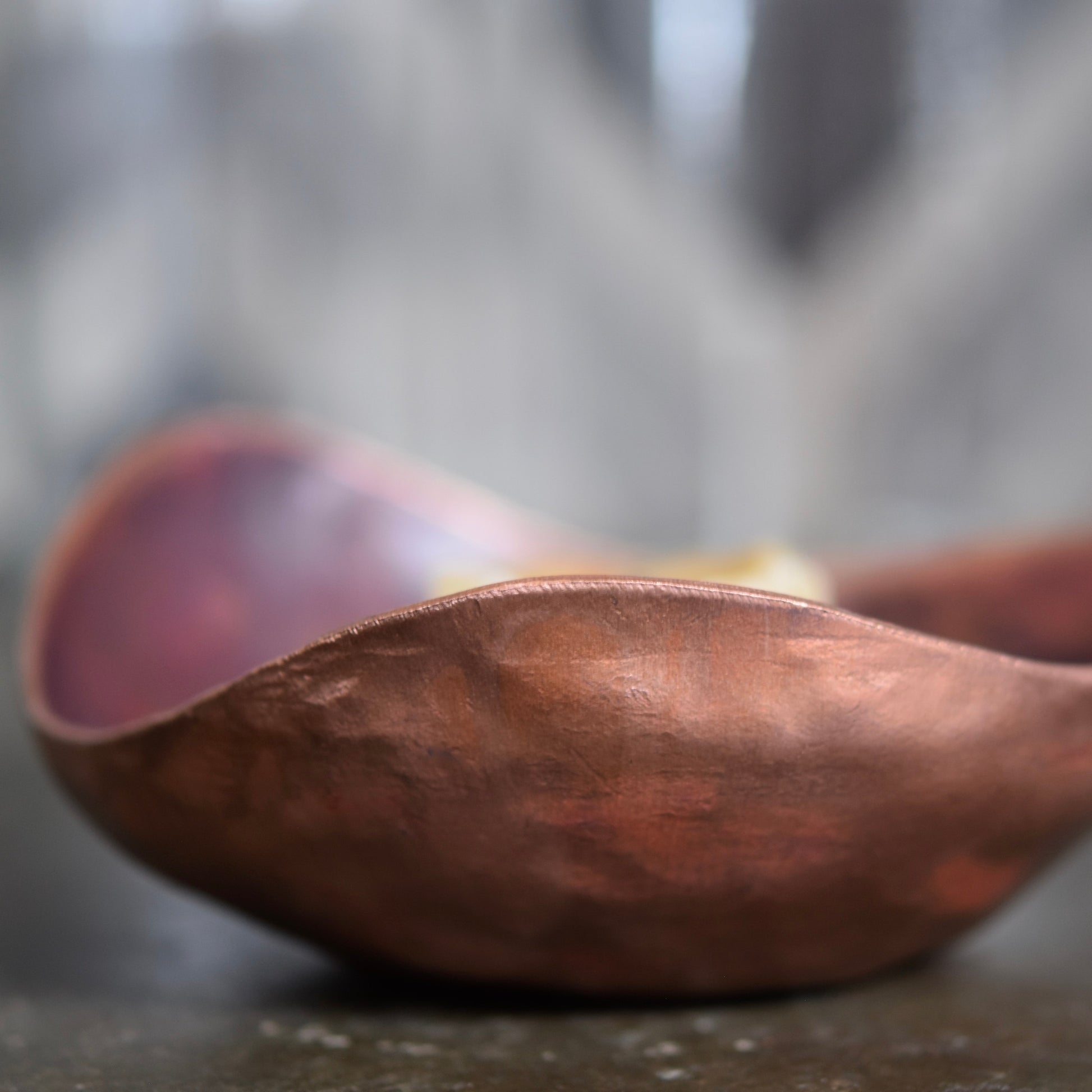Our copper bowls are finished with a semi-permanent coating of raw beeswax which allows the copper to slowly develop its own unique patina as it ages. Expect your copper to darken with the passage of time.